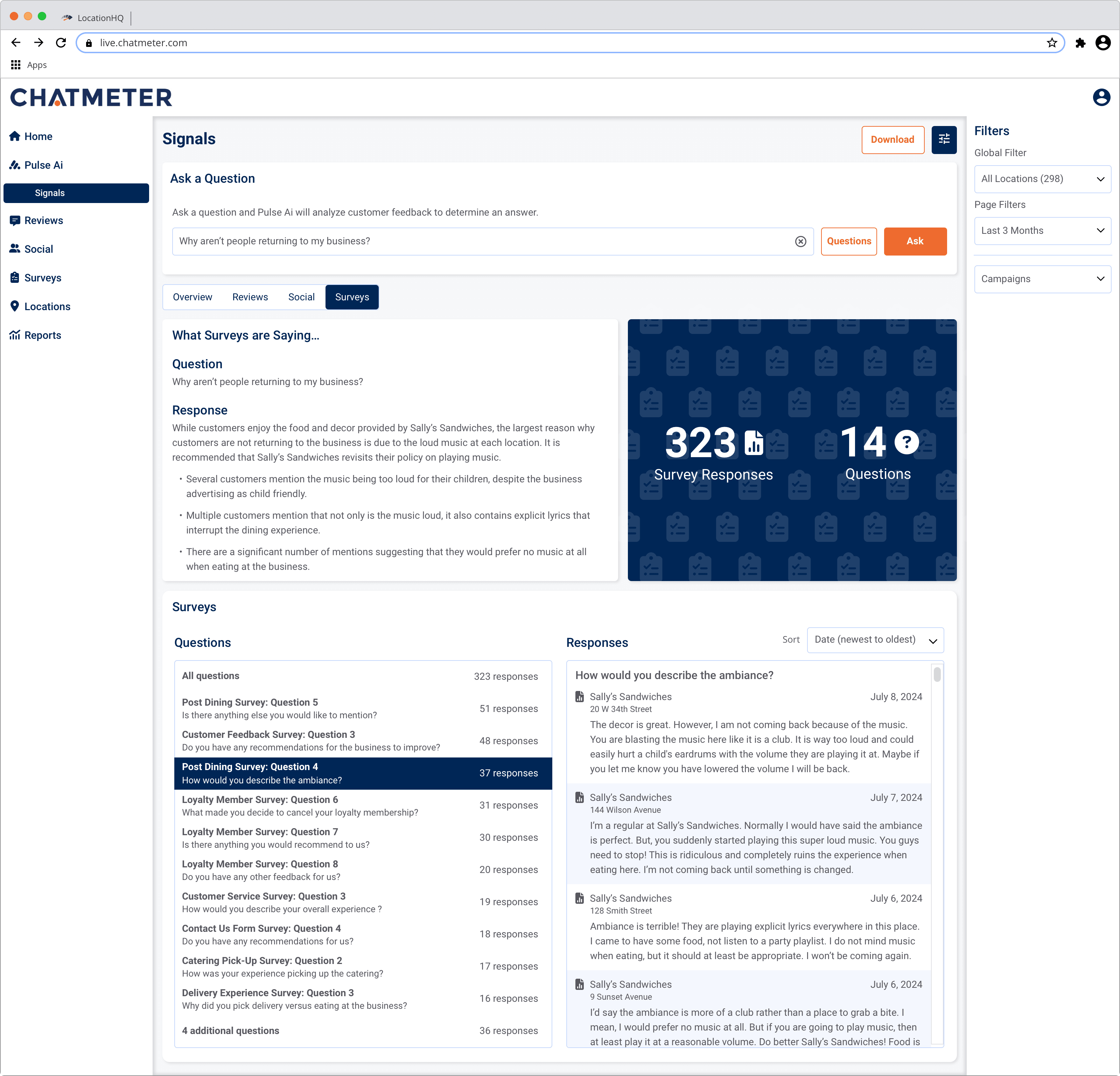 SAN DIEGO, CA, JULY 29, 2024 – Chatmeter, the leader in multi-location intelligence, today announced the release of Surveys 2.0, a first-of-its-kind solution from its Pulse Ai: Signals platform. This new AI-driven solution provides multi-location businesses with a comprehensive 360° view of customer insights by continuously analyzing survey data, reviews, and social data together in real-time – a first in the industry. This groundbreaking solution provides precise understanding of customer advocacy behaviors and motivations at both the location and enterprise level, setting a new standard in survey intelligence for multi-location brands.
